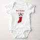 Este fato para o seu bebê tem um gnomo bonito entre duas canetas doces no topo de uma estocagem de Natal vermelha e branca com o texto Feliz Natal em vermelho.