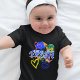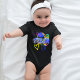 Este traje para bebês estilo grafite apresenta a palavra "fresco" no seu design, juntamente com três corações, um arco-íris e um pano de fundo de tinta. Este é um design único e divertido para bebês. Você pode adicionar as iniciais do seu bebê legal às costas.