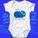 Uma baleia adorável, que parece sorrir, esportes lindos tons azuis do mar. As palavras "Eu adoro a Ilha de Jekyll" estão abaixo da baleia e o nome do seu filho é colocado acima. O texto abaixo da baleia é facilmente alterado para outra frase de sua escolha. Celebre o seu amor pela costa da Geórgia e as magníficas ilhas Ouros com este doce pedaço de bebê.