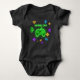 Jogo em camiseta de bebê gamer verde-neon, azul e amarelo.
