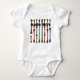 Este macacão-bebê tem uma design de linhas atômicas moderna do século médio com "penas" em ambas as extremidades e um esboço em torno de cada uma.