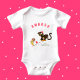 Macacão de bebê com macaco pequeno engraçado e banana correndo