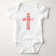 Este macacão-bebê é unisexo e apresenta uma fonte impressão ousada com letras vermelhas de duas tonalidades que exibem a escritura e citação da bíblia "Matthew 7:7" KJV desenhada na forma de uma cruz com sotaques no tema baseado na bíblia. Este fato é um ajustado padrão com etiqueta de rasgão fácil, além de um fecho fácil de três estalos e um fecho de agulha dupla em todas as aberturas.