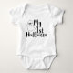 Minha roupa de bebê Cute Ghost de 1rua de Halloween apresenta o texto "My 1rua Halloween" em letras modernas de escrita de caligrafia com letras negras e acentua-se com um lindo bebê ou fantasma de menina. Perfeito para a primeira festa de Halloween ou celebração do bebê. Elaborado por ©Evco Holidays www.zazzle.com/store/evcoholidays