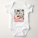 Body de Bebê Menina Menino Meu Primeiro Natal Imagens Groovy Retrô Fofas apresenta o texto "Meu 1º Natal" em tipografia moderna com itens fofos como um caminhão com árvore, camiseta feia, enfeites, presentes, meias, azevinho, árvore de Natal e decorações. Presente de Natal perfeito para uma menina ou menino bebê. Criado por Evco Studio www.zazzle.com/store/evcostudio