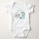Este macacão-bebê apresenta um coelho de desenho azul com a legenda Minha Primeira Páscoa, rodeada por flores rosas e roxas. Facilmente personalizável adicionando o nome do seu filho no topo.