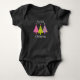 Três árvores bonitinhas e festivas, cor-de-rosa, roxa e verde, podem ser vistas neste adorável traje com a frase "meu primeiro Natal".