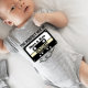 Uma roupa de bebê divertida e personalizada, com a combinação perfeita de nome de Mãe, nome de Pai e nome do bebê, juntamente com a data de nascimento do bebê. O design é maravilhosamente arranjado, com cada nome estilizado em uma fonte moderna e divertida. Para adicionar um toque caprichoso, uma ilustração de fita cassete antiga é incorporada ao design, com a fita cassete decorada com bobina com coração. A fita cassete simboliza a harmonia e o amor que esta nova família compartilha, misturando o encanto da velha escola com a nova alegria da nova chegada. A data de nascimento é colocada criativamente perto da fita cassete, fazer-a de uma vigilância especial que marca o início de uma bela viagem. Esta design combina nomes de família sentimentais com uma vibração divertida e retrô, fazer-a como o presente perfeito para novos pais. Esta design combina elementos pessoais com uma reviravolta nostálgica, fazer ideal para celebrar a nova chegada ao estilo!