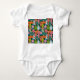 Este macacão-bebê tem uma design de Natal de um conjunto de vários ornamentos em muitas cores.