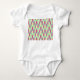 Este macacão-bebê tem um design geométrico de fundo feito de retângulos verdes-marinhos e azuis-claros com ovais amarelos e cor-de-rosa no topo.