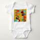 Este body de bebé tem um desenho moderno de meados do século de meio-ovais numa paleta de cores retrô. Colorido, arrojado, divertido! Procure pela chupeta, babador e almofada combinando.