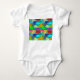 Este macacão-bebê tem uma design de uma escola de peixes nadando no oceano em verde, azul, laranja, amarelo, vermelho, rosa e azul-esverdeado. Altere o texto ou remova-o completamente, se desejar.