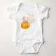 Belo traje de bebê com pequeno desenho de abóbora e texto personalizado.
