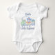 Adorável trem de brinquedo pastel e feliz bebezinho tomando uma carona. O texto diz Pai pequeno.