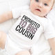 Este design específico apresenta uma frase fofa impressa na frente que diz "Promovido ao primo mais velho". O texto provavelmente está em uma fonte lúdica e infantil que acrescenta à natureza alegre e divertida da mensagem. A frase "Promovido ao primo mais velho" sugere que o bebê tem um novo membro na família, um primo mais novo, e celebra a emoção e a responsabilidade desse novo papel. O design provavelmente irá agradar aos pais ou cuidadores que têm uma família em expansão e que desejam reconhecer os importantes marcos e transições que ocorrem como resultado. A mensagem é divertida e cativante, destacando o vínculo especial entre os primos e a alegria que vem com a chegada de um novo membro na família.