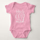 Um belo traje de bebê de Natal apresenta "bebê está frio lá fora" em tipografia branca, escrita à mão, acentuada com flocos de neve.
