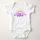 Uma roupa fofa para bebês que diz "Sol da Mamãe" em rosa e roxo com raios solares em laranja e amarelo.