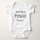 Alguém no Texas me ama! Traje bonito com bluebonnets, flor silvestre do Texas soletrando o nome do estado. O verso apresenta a letra B para Bebê e Bluebonnets formadas com a flor.