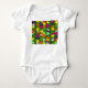 Este macacão-bebê tem um design moderno do século médio de sobreposição de triângulos em cores floridas que correm verticalmente num campo de verde.