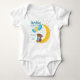 Bela e colorida estátua de nascimento de um bebê com um adorável desenho animado de ursos peludos com uma fita arco azul sobre uma lua dormindo segurando balões em estrelas amarelas e azuis e coloridas. Adorável, o bebê nasceu é arte. Fácil de personalizar substituindo o nome e os detalhes.