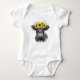 Brilhante, alegre e adorável! Este belo traje apresenta uma vaca feliz cercada de girassóis — perfeita para seu pequeno sol!