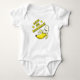 Um terno de uma peça para bebês, com um desenho animado fofo, uma banana amarela feliz kawaii com os sorrisos mais doces, grandes olhos redondos e metade descascada. Acima dele, em letras amarelas, com uma sombra negra lendo 'Vamos Bananas!' Duas estrelas amarelas brilhantes são de ambos os lados das palavras.