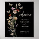 Boho Black Welcome Poster. Esta na moda e elegante poster de boas-vindas do casamento apresenta uma linda borboleta de cor d'água pintada manualmente e flores silvestres organizadas como um buquê adorável. Encontre itens correspondentes na Coleção de Casamentos de Flor Selvagem Moody Black Boho.