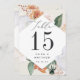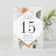 As placas de números florais de boho chic apresentam uma borda em forma de diamante de folhagem verde-aquática e flores em tons de pêssego, marfim e branco inspirados no deserto macio, moldando seu número de tabela em carvão rico. Personalize com seus nomes e data de casamento, ou nomeie cada mesa para um toque pessoal extra. Design repete-se no lado oposto. Coordena-se com o nosso casamento floral e o convite para eventos do Boho Blooms.