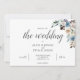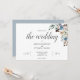 O convite para o casamento Boho contém flores azuis empoeiradas e beige neutra com folhas secas.