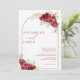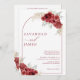 Boho Burgundy Floral Arch Invitation Este convite de casamento ao estilo boêmico apresenta dois arranjos florais burgundy com grama pampas e um arco de linha. A parte de trás do convite apresenta a foto do casal também em um arco e alguns detalhes.