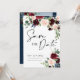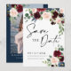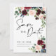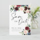 Boho Burgundy e Blush floral Salve a data Convite. Esse convite se caracteriza por boho burgundy e rosas e flores esmagados com duas fontes modernas de alta classe que moldam as tendências dos eventos festivos atuais e futuros.