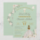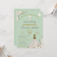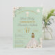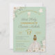 Incrível Primeira Sagrada Comunhão de convites florais com rusticidade, vintage inspirou elementos com a garota de vestido branco tradicional, contra um fundo verde de sábio macio. A parte de trás do convite apresenta uma cruz de estilo boho com flores de aquarela e verde. Troque a 'Primeira Comunhão' por 'Christening' ou 'Baptism', qualquer que seja o seu evento especial.