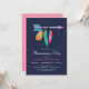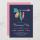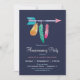 Convite para comemoração de festas de limpeza doméstica, rosa e azul-marinho. O Convite apresenta uma seta turquesa e cor-de-rosa com penas cor de laranja, verde e rosa.