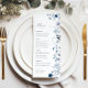 Boho Dusty Blue Marinho Whimsical Wildflower Elegant Simple Wedding Menu Modelo. Modelo de menu minimalista de flor silvestre branca, ao estilo boêmico, com flores azuis e marinhos empoeiradas e botânicos, impressos à mão, em aquarela. Modelo de menu editável para primavera, verão, outono (outono) e casamentos no inverno.