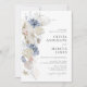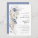 Boho Rustic Elegante No Convite Simples De Casamento Azul Da Praia. O estilo boêmico arranjou conchas balneares minimalistas com elegantes e simples conchas e corais de bolor, azuis e creme, com impressão em branco. A cor de fundo azul empoeirada é linda para casamentos de boho e casamentos de praia. Convites editáveis para primavera, verão, outono (outono) e casamentos no inverno.