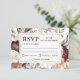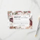 Um maravilhoso design de cartão de resposta floral de casamento de fantasia boho fantástico. Tem uma paleta de cor sumptuamente neutra em bege, verde, pêssego, e tons de rosa e terracota misturados com tons de outono de marsala de burgundy profunda. Uma bela estrutura retangular com sotaque dourado adiciona elegância ao design. A parte de trás do cartão tem um padrão floral que combina com elementos florais espalhados pelo design. Personalize com a data de resposta necessária.