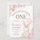 Boho Floral Cor-de-rosa Convite para primeiro aniversario Bunny Sweet alguns coelhos estão fazendo um primeiro convite de aniversário com um coelho branco grande e um balão rosa. O design também apresenta um arranjo floral cor-de-rosa-boho com grama-pampas e alguns pontos falso de brilho dourado. Este é um belo design de convite para o primeiro aniversário para as suas meninas, coelhinho, a primeira festa de aniversário.