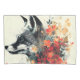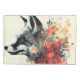 Retrato místico de raposa branca e preta rodeado por flores vibrantes e coloridas.