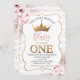 Boho Floral Princess Crown primeiro aniversario Convite À primeiro aniversario da princesa doce, cor-de-rosa e ouro, apresentando uma grande palavra falsa dourada, e coroa, assim como dois arranjos florais cor-de-água rosa com algumas ervas-pampas. Este design também apresenta um quadro decorativo e pontos falsos de brilho dourado.