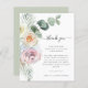 Boho Florals Foliage Wedding Obrigado. Um alternativo MENOR de 4,5" x 5,6", compatível com o orçamento. Disponível em um STOCK de PLACA SEMI GLOSS 110 lb ou um STOCK de PAPEL THINNER SATIN FINISH 80 lb. Os envelopes são um extra opcional. Personalize facilmente o texto para seus próprios detalhes. Um fundo verde de sábio coordenado está atrás.