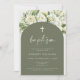 Este convite batismo apresenta um estilo boho com flores verdes e brancas para a forma perfeita de convidar amigos e família para o batismo ou batizar de seu ente querido.