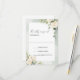 Esta é uma placa de RSVP boêmica que apresenta folhagem verde e eucalipto com rosas brancas florescentes e alfaces de caligrafia rico.