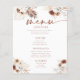 Nosso elegante Menu Casamento é a maneira perfeita de anunciar seu dia de casamento aos seus convidados. Cada cartão apresenta designs florais intrincados e uma bela tipografia em cores neutras, incluindo terracota, bege e e tons de terra. Impresso em estoques de cartolina de alta qualidade, eles certamente impressionarão seus convidados e darão o tom para seu dia especial. Minha coleção de casamento em um design boho, com flores de aquarela, pampas e tons de terra, inclui tudo o que você precisa para tornar seu dia especial realmente inesquecível. Coleção: https://www.zazzle.com/collections/watercolor_boho_pampas_wedding_collection-119346973241911782
