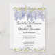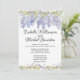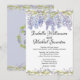 O design floral de Boho apresenta uma wisteria azul roxa que escorrega graciosamente através de sua vinha. A videira e apenas algumas flores armam o fundo do convite. As mesmas duas fronteiras estão no fundo do convite para o casamento. Uma coroa de wisteria está no centro com os nomes dos casais de casamento. Há um fundo púrpura/azul macio no verso e branco na frente. Você pode mudar essas cores.