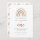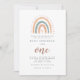 Um convite de primeiro aniversário moderno e chico com design de arco-íris bonitinho em cor pastel para um tema de boho.