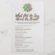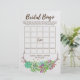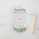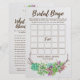 Este jogo "bridal bingo" floral floral "boho rustic" é perfeito para um chá de panela temático do deserto. A frente do cartão de jogo apresenta "bridal bingo", e a parte de trás do cartão apresenta "o que o noivo disse?" com perguntas personalizáveis. A design apresenta ótimas suculentos verdes, cor-de-rosa e roxo, dispostos em uma coroa de galho e acentuados com falso confete de ouro. Personalize a frente da placa com o nome da noiva e a data do chá.