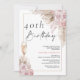 Boho Silk Rosas Pampas Grass Birthday Convite Bohemian inspirou um convite de aniversário com dois arranjos florais naturais coloridos e pálidos ou pincelados com grama pampas e uma imagem caligráfica moderna preta como título. Ideal para quem procura um aniversário inspirado na boêmia.