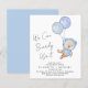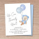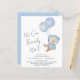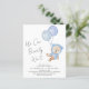 Boho casal convite para chás, amigável com orçamento, apresentando uma ilustração de uma aquarela fofa de um ursinho azul flutuando com balões, e "Nós podemos esperar" em um roteiro de caligrafia manuscrito. Adicione os nomes dos pais a serem e os detalhes do chá em tipografia simples.