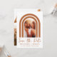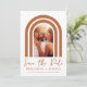 Este casamento do boho-arch salve o cartão de anúncio de data com duas fotos e o terracotta chic salve o script de data lettered em um fundo branco limpo. O verso é uma foto de cheio. Avise aos hóspedes que você os convidará para o próximo casamento com esta simples foto minimalista, salve o cartão de data (os convites clássicos de coordenação de casamento podem ser enviados posteriormente e estão disponíveis para serem comprados separadamente).