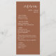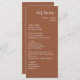 Este moderno cardápio do casamento de terracota apresenta uma design minimalista com um esquema de cores do deserto de terra, do boho e uma tipografia moderna e limpa. Terracotta é uma nova tendência de cores para 2021 e é um tom adorável, saturado e quente, neutro. Uma suíte de casamento coordenada está disponível.